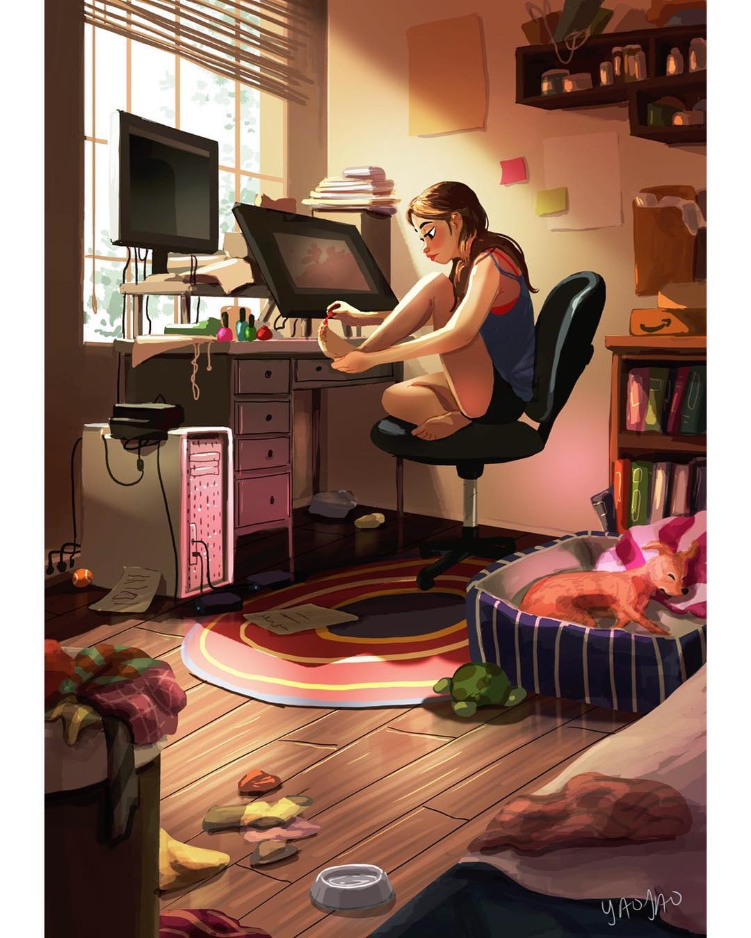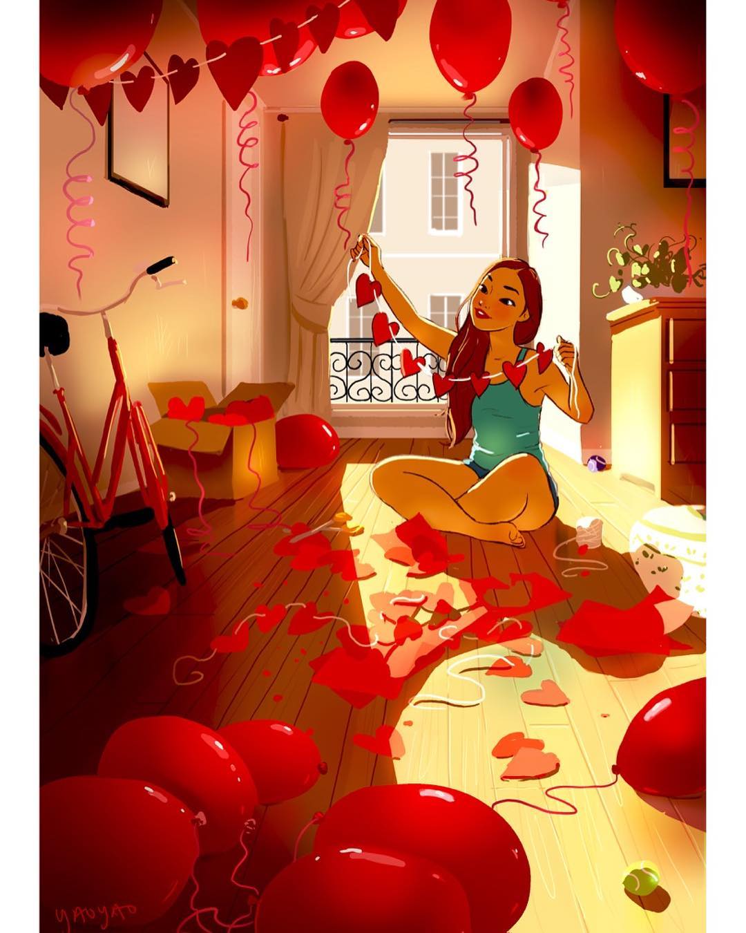 แต่สำหรับเพื่อน ๆ คนไหนที่ในวันคริสต์มาสไม่มีแผนที่จะทำอะไร หรือต้องอยู่คนเดียวก็ไม่ต้องเสียใจไปนะจ๊ะ เพราะถึงแม้ว่าในวันเทศกาลแบบนี้เราจะต้องอยู่คนเดียว เราก็สามารถมีความสุขได้เหมือนกัน และนี่ก็คือภาพที่สื่อออกมาให้เราได้เห็นถึงข้อดีของการอยู่คนเดียว ถึงไม่มีคู่ก็แฮปปี้ได้ ซึ่งเป็นผลงานการวาดภาพของ Yaoyao Ma Van As (เว็บไซต์ผลงาน : www.yaoyaomavanas.com) อย่ารอช้า!! มาชมกันเลย